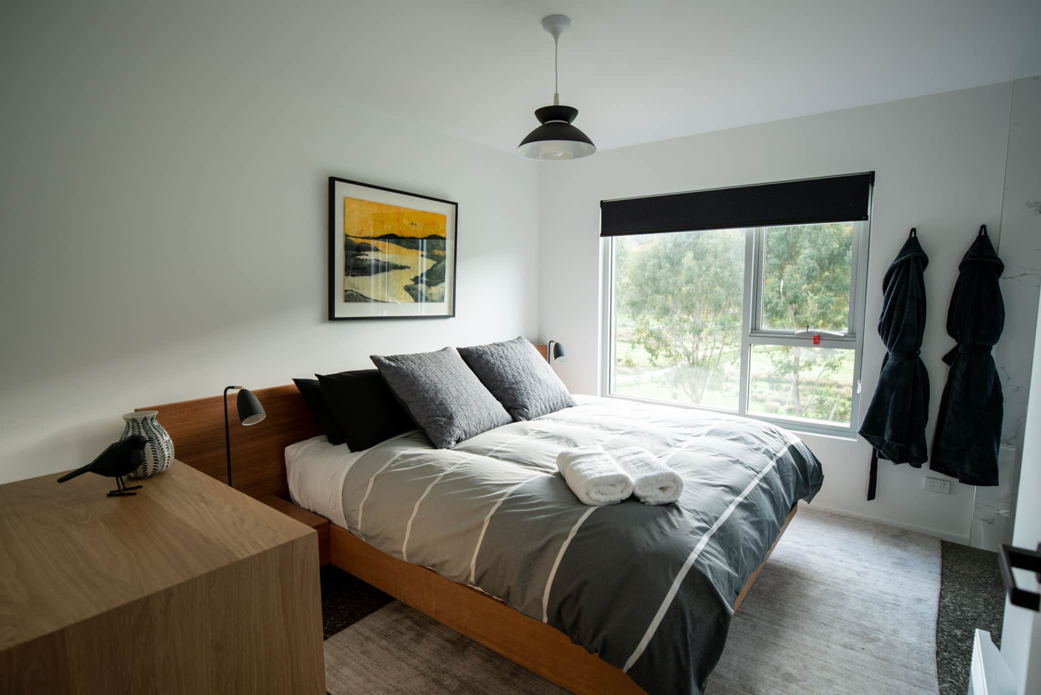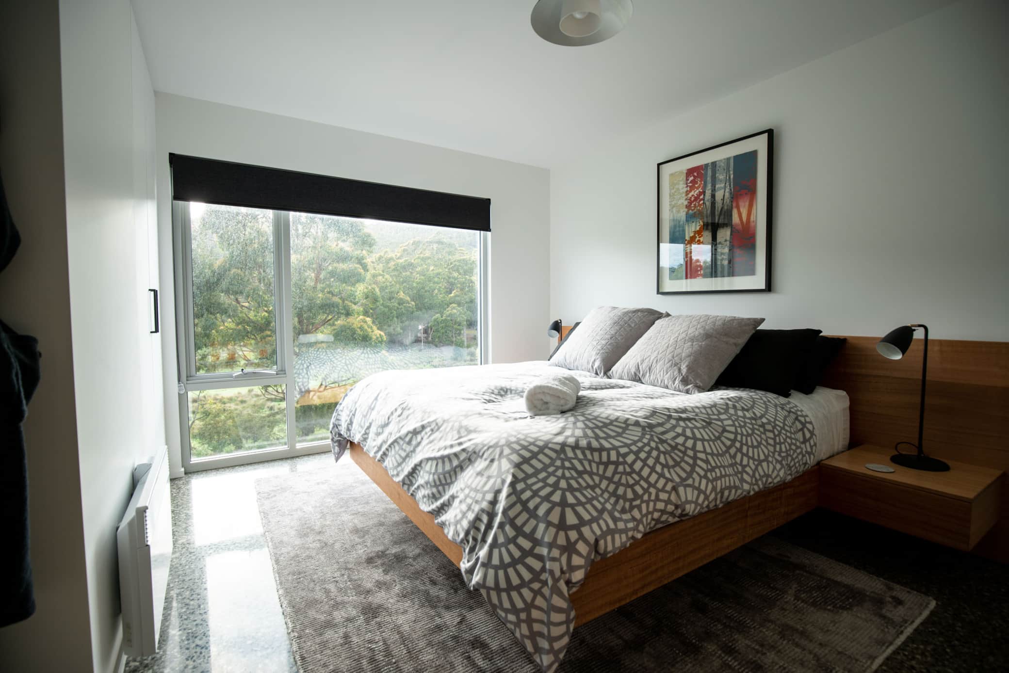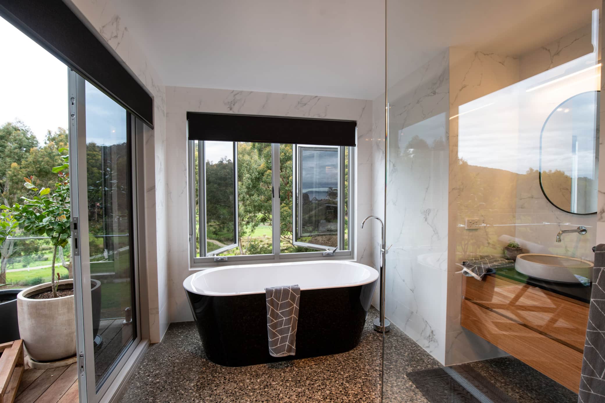 The bathroom is a sanctuary in itself, with gleaming marble, polished concrete and a luxurious freestanding bath that invites you to soak away your cares while you enjoy the view.